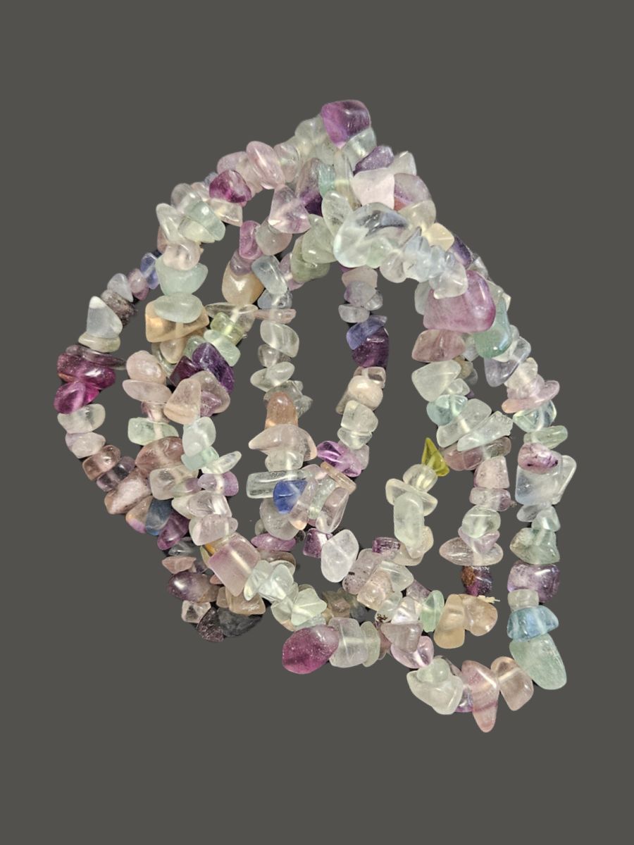Tento náramek ze sekaného fluoritu vám nabídne jedinečný kousek přírody s kamínky v barvách od fialové přes růžovou až po zelenkavou. Každý náramek je originál – může se lišit od vyobrazení na fotografii.