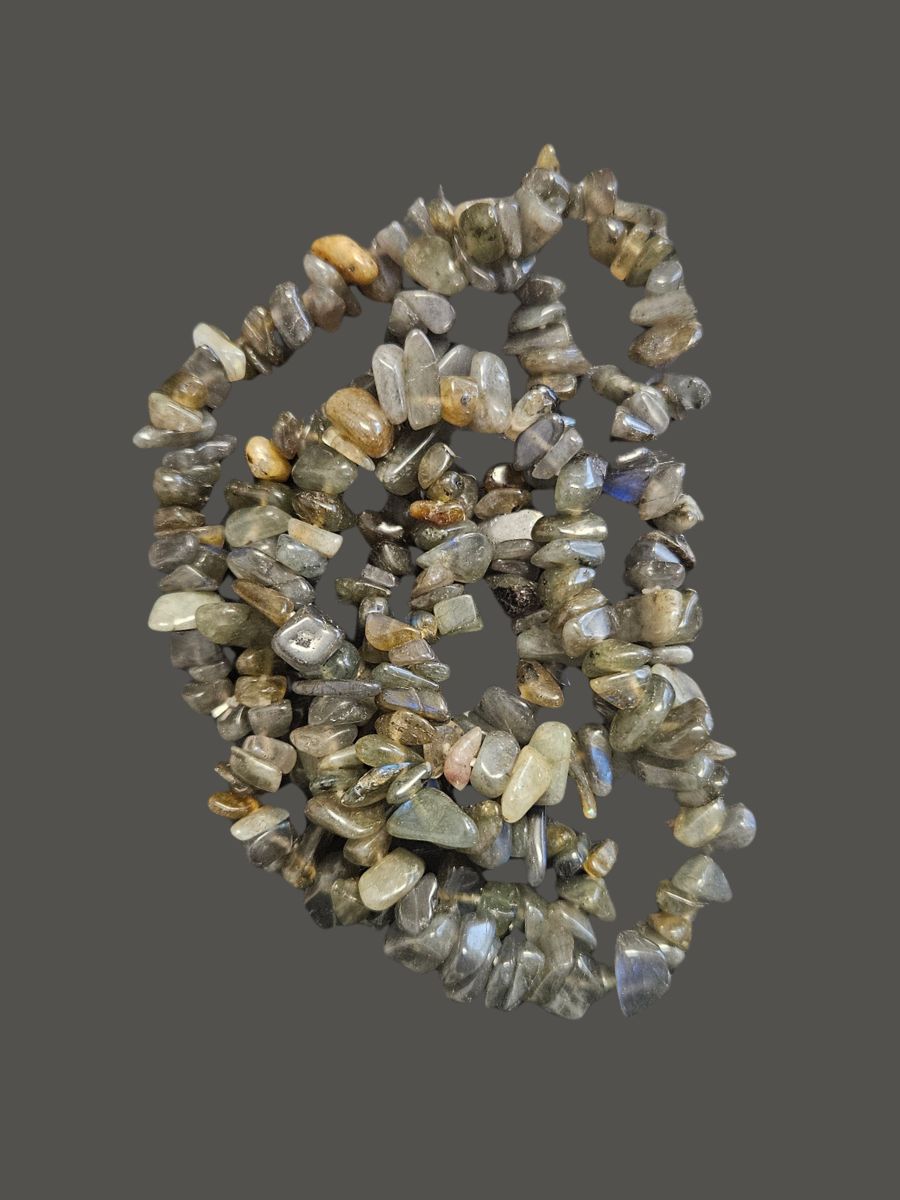 Tento náramek ze sekaného labradoritu  s jedinečnou hrou barev. Labradorit se vyznačuje tzv. labradorescencí – proměnlivými odlesky v odstínech modré, zelené, zlaté a fialové, které se objevují při pohybu kamene ve světle. Základní barva kamene je šedá až tmavě šedá, ale právě tyto duhové záblesky činí každý kousek naprosto unikátním. Váš náramek se může lišit od vyobrazení na fotografii. ve skutečnosti je tmavší, než na úvodním obrázku