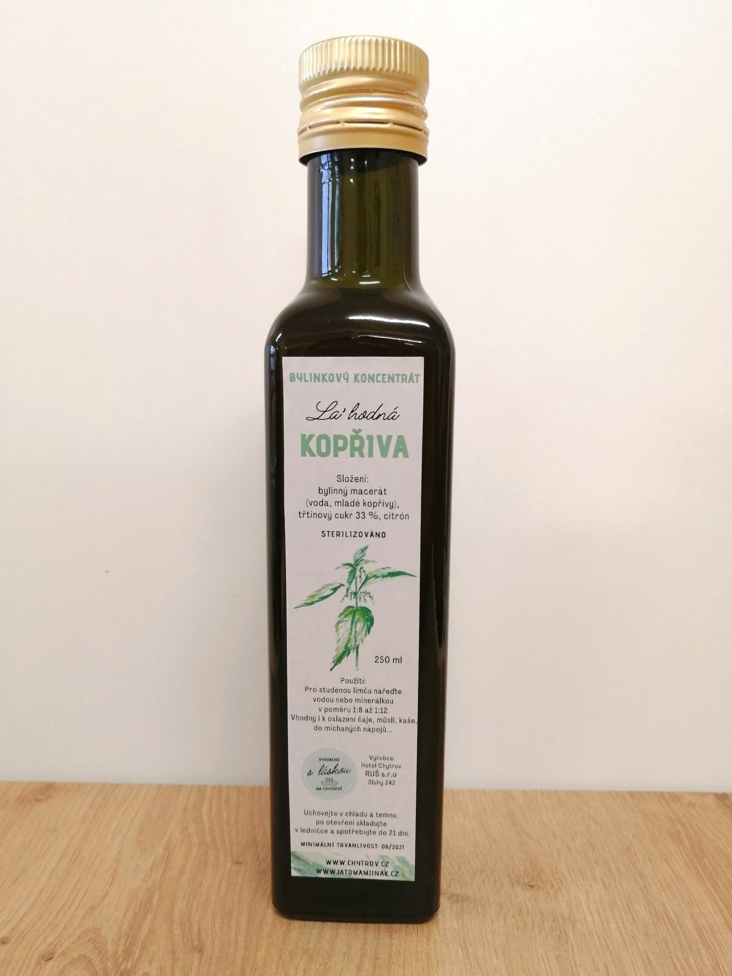 Složení: bylinný macerát (voda, mladé kopřivy), třtinový cukr 33 %, citrón