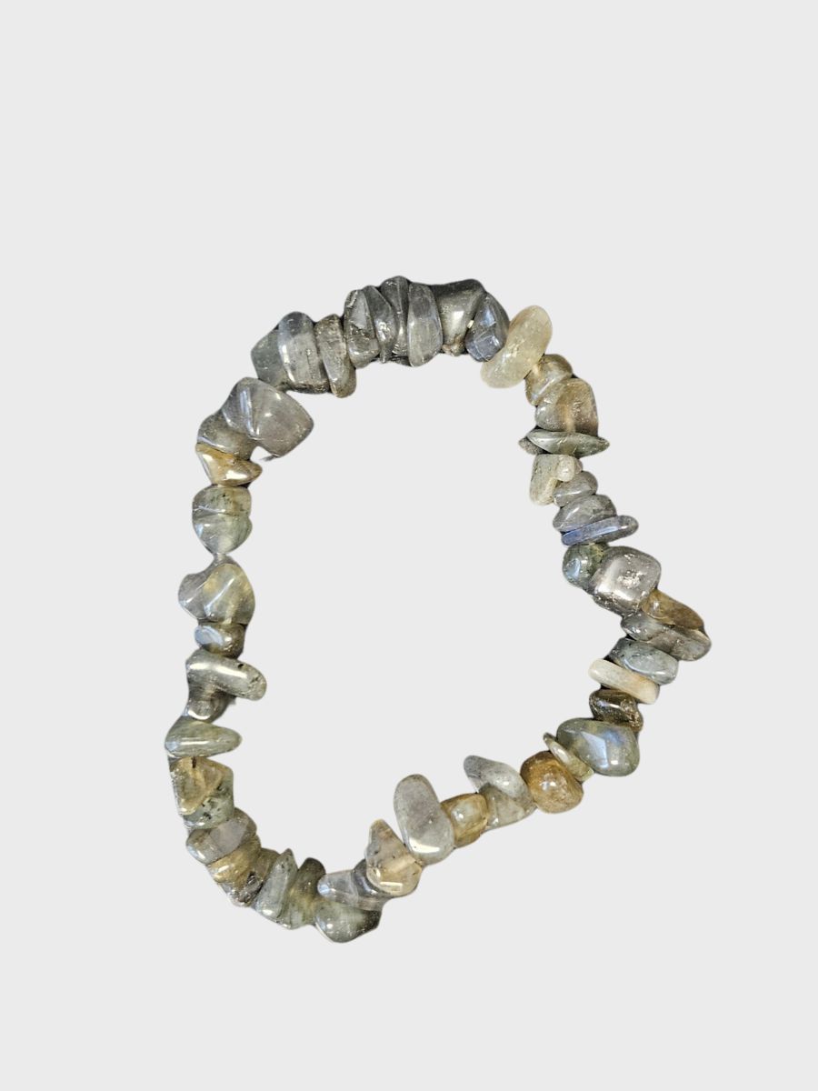 Tento náramek ze sekaného labradoritu s jedinečnou hrou barev. Labradorit se vyznačuje tzv. labradorescencí – proměnlivými odlesky v odstínech modré, zelené, zlaté a fialové, které se objevují při pohybu kamene ve světle. Základní barva kamene je šedá až tmavě šedá, ale právě tyto duhové záblesky činí každý kousek naprosto unikátním. Váš náramek se může lišit od vyobrazení na fotografii. ve skutečnosti je tmavší, než na úvodním obrázku